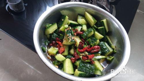1. 准备食材:将黄瓜洗净,切成条状;辣椒洗净,切成小段;准备好适量的盐、糖和醋。